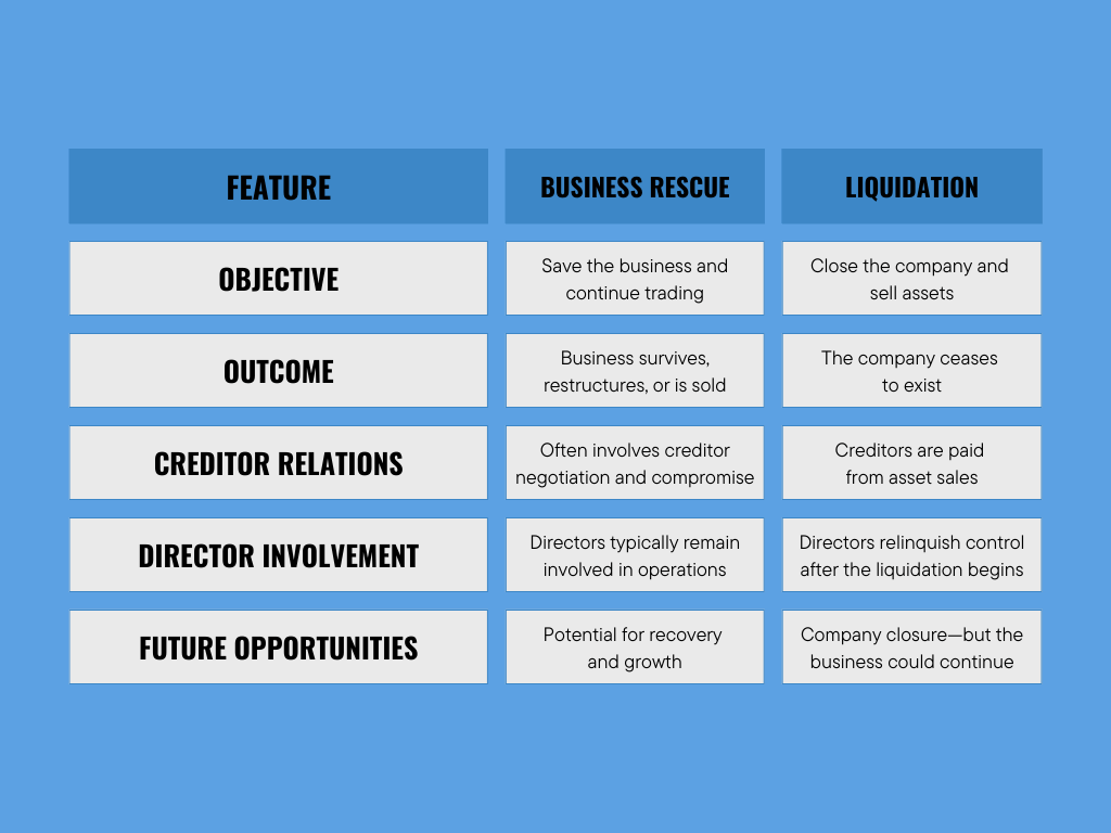 Understanding the distinctions between business rescue and liquidation is crucial when deciding your next steps. Clarifying these differences helps you approach the situation with the right mindset and realistic expectations. Here’s how they compare: